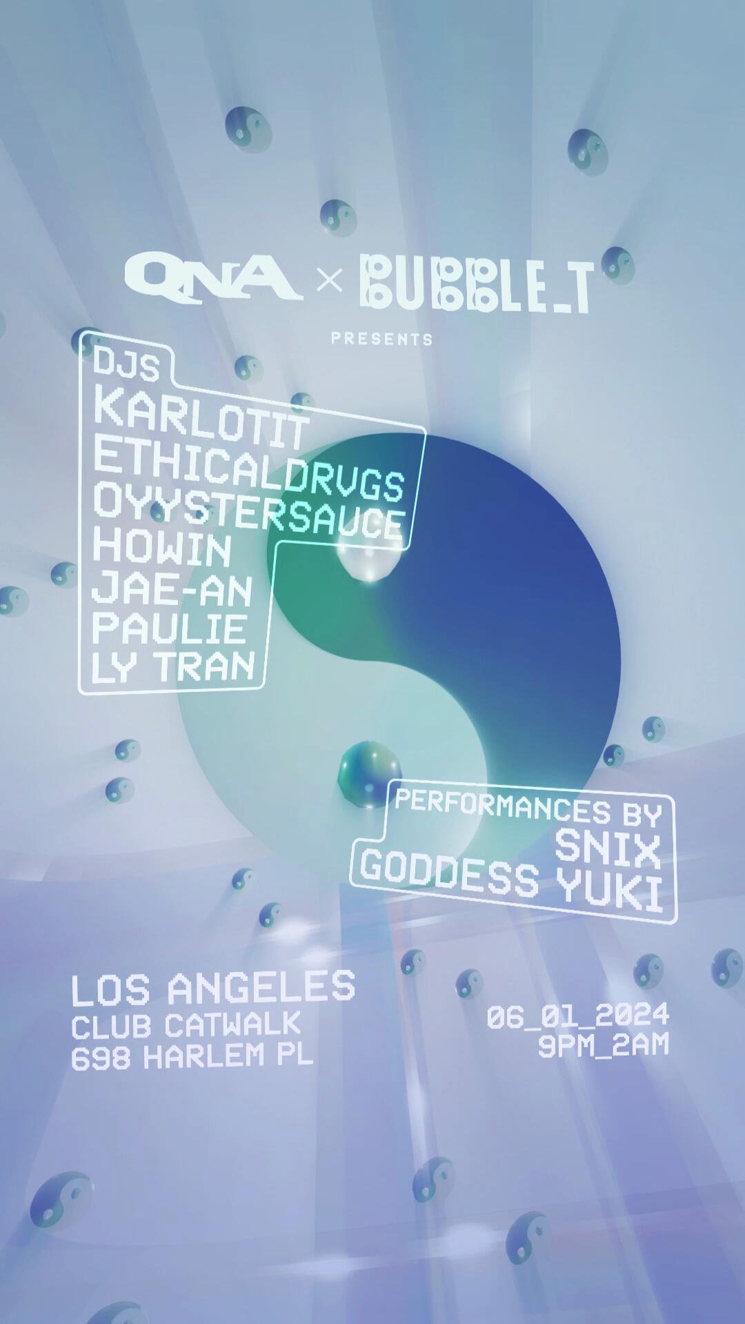 QNA X BUBBLE_TThe collab you’ve all been waiting for ‼️ 🥵 For pride this year, your fave coastal collectives come together in a two part(y) series giving you a dynamic blend of yin and yang ☯️ ♋️ 💟ALSO: We're partnering with Kikori Whiskey to provide complimentary Kikori beverages to early arrivers —Mark your calendars, we’re doubling down 😛 💦JUNE 1ST / LA